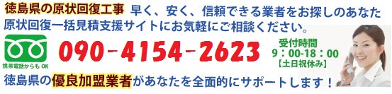 徳島県で原状回復工事を予定されているあなたが、数あるホームページの中から当サイトを訪れて下さったことに心より感謝いたします。 四国では原状回復工事はあまり知られていない工事ですので、他の地域からの企業様にとって工事が必要となった際、どの業者に頼めばいいのか等、何らかの疑問や悩みを持つのは当然のことです。 もしあなたが、出来るだけ安く、安心して原状回復を行なうためにこのサイトを訪れてくださったのだとしたら、まずはお気軽にご相談ください。 あなたの悩みを解決するため、スタッフ一同全面的にサポートすると同時に、当サイトに加盟している徳島県の信頼できる原状回復業者をあなたにご紹介致します。 当サイトは、完全無料で利用することが出来ます。もちろん、あなたから仲介手数料等は一切いただきませんので、安心してご利用下さい。 徳島県の対応地域