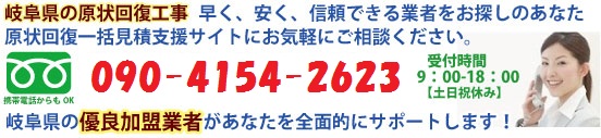 この施主様方も、その工事業者に交渉といえども、なかなか、この郷里風土が邪魔をしまして値引きを交渉できないという施主様の問い合わせも多々ございます。 また、原状回復工事業者さんは、一般的に営業というものをしません。 店舗やオフィスを個別に訪問して「引越しされる予定や店を閉める予定はありませんか?」などという営業をすることはできません。 では、原状回復工事業者さんはどのようにして仕事を取っているのでしょうか? 岐阜も多いのですが多くの業者さんは、管理会社や不動産などと契約して、仕事を受注しています。 しかし、管理会社や不動産を通して原状回復工事を依頼すると、当然余分な経費がかかる分、工事代金が高くなります。 これはお金を払う側とすれば、決していいことではありません。 原状回復一括見積支援サイトでは、お客様がもっと簡単に、しかも安く工事が依頼できるよう、お客様と岐阜県の原状回復工事業者の出会いをサポートいたします。 当サイトにはサイトの加盟基準をクリアした優良な岐阜県の原状回復工事業者が多数加盟しております。 まずは、お気軽にご相談ください。 サイトの利用は無料ですので、安心してお申込み下さい。 岐阜県の対応地域