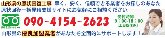 業者を探すのが面倒だからとういう理由で、管理会社や入居時にお願いした内装業者に頼んでしまったりします。その結果、倍近くの工事費を余分に払うことになり、後で悔しい思いをした方もいます私たちは、無駄な工事費を余分に払い、あなたにその様な悔しい思いをしてほしくありません。当サイトで紹介させていただく原状回復工事業者は、サイトの趣旨に賛同してくださった山形県の優良業者です。 当然、地元の原状回復工事を専門としている業者ですから、内装工事業者や管理会社を通して依頼した時のように高額な金額になることはありません。 どうぞ安心して、当サイトを通して最安の山形県の原状回復業者を探してください。 山形県の対応地域